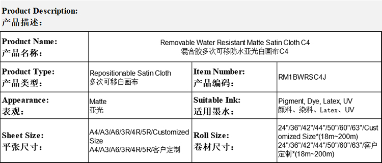 混合胶多次可移防水亚光白画布C4 Removable Water Resistant Matte Satin Cloth C4